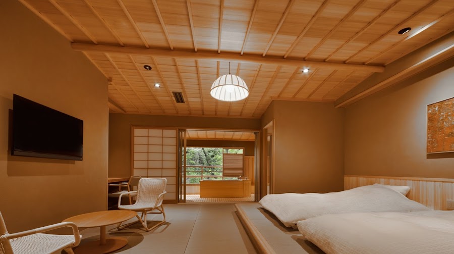 Situé dans la préfecture d'Ishikawa, Araya Totoan propose 18 chambres de style japonisant possédant chacune un salon et une chambre minimalistes : tatamis, futons, table et chaises basses pour les repas, couleurs neutres et ambiance zen assurée. Et quelques touches de modernité qui paraîtraient presque surprenantes.