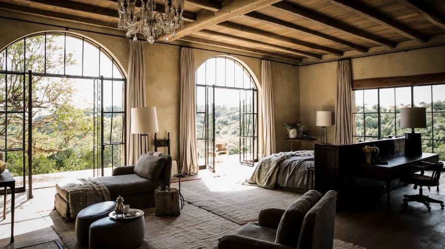 Les suites spacieuses habillées de lin froissé, éclairées de grands chandeliers, offrent un luxe dépouillé, avec cheminée, baignoire en cuivre et douche extérieure. La circulation entre les pièces, mais aussi entre le dedans et le dehors, est fluide : le silence aussi bien que les conversations animées circulent entre la salle à manger, le salon, la bibliothèque, la salle de cinéma et la salle de jeux.