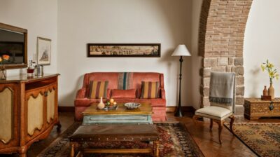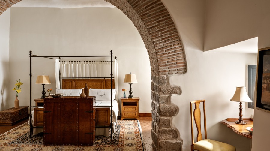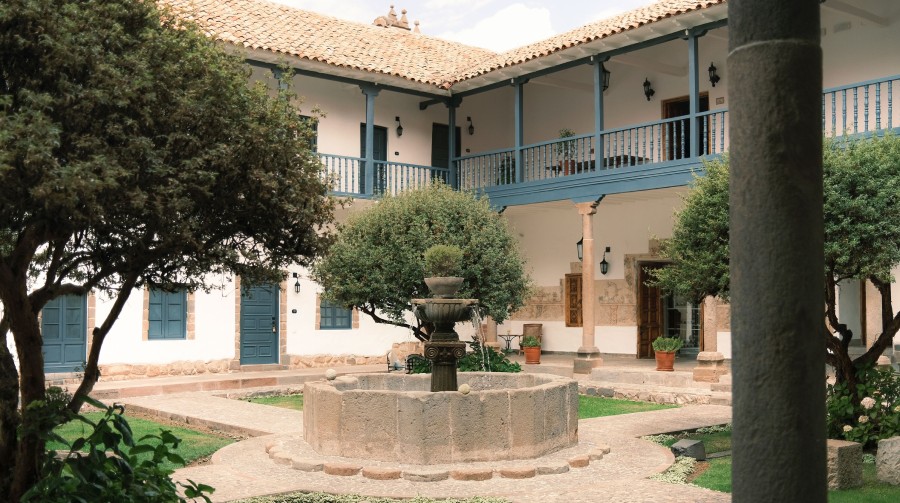 L’architecture coloniale a été patiemment restaurée, respectant la noblesse originelle du lieu tout en y insufflant une élégance contemporaine. Les patios intérieurs, rythmés par les arcades de pierre et les fontaines discrètes, structurent l’espace et invitent à la contemplation. Les couloirs voûtés conduisent à des salons apaisés, où bois sombres, textiles andins et œuvres d’art soigneusement choisies dialoguent avec les murs chargés d’histoire.