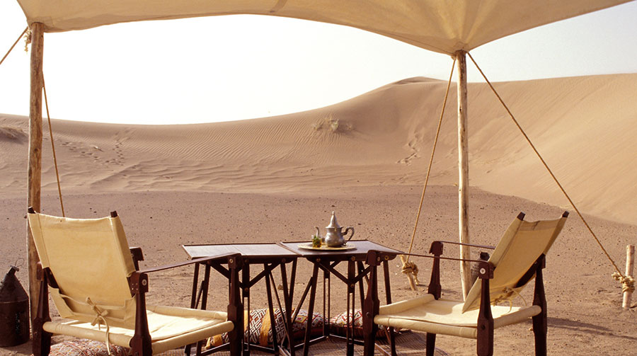 En effet le campement constitué d'une à trois tentes est réservé de manière exclusive, pour un couple ou pour un seul groupe de voyageurs. Depuis Dar Ahlam le trajet s’effectue à travers des paysages rocailleux qui finissent par s’adoucir. Le Camp des Dunes se découvre au coucher du soleil, comme un mirage. Les tentes sont dressées et le dîner servi autour d’un feu de camp. Quand l’obscurité est totale, la voûte céleste s’impose en majesté. L’éclairage à la bougie n’atténue en rien la magie du spectacle. Les constellations et le silence du désert invitent à une fabuleuse expérience nocturne.