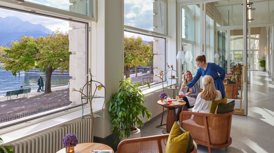 Les vastes parties communes rappellent les fastes du Grand Tour, réinterprétés avec modernité. Le grand hall, ponctué de colonnes et de lustres en cristal, conduit aux salons feutrés et aux terrasses panoramiques où se dessine la silhouette du lac. Côté gastronomie, le Colonnade célèbre les produits suisses et méditerranéens dans une mise en scène subtile, tandis que le restaurant japonais Minamo charme par la rigueur et la délicatesse de son art culinaire. Le MOzern Bar & Brasserie, lieu vibrant et cosmopolite, attire autant les voyageurs que les Lucernois venus savourer un cocktail signature face au miroitement des eaux.