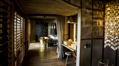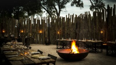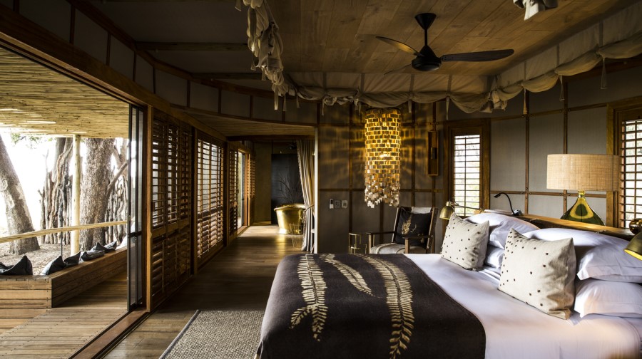 Situé en plein cœur de la réserve de Moremi, sur une île pittoresque, ce lodge-palace mis en scène par l'architecte sud-africain Sylvio Rech, abrite douze suites réparties sur deux camps autonomes : Mombo, qui propose neuf chambres somptueuses, et Little Mombo, plus intime encore avec ses trois tentes. Luxueusement meublées, les tentes érigées sur pilotis se divisent en deux parties: une immense chambre aux tonalités de brun et de crème avec un bureau en bois cérusé et un coin salon donnant sur la terrasse et une somptueuse salle de bain , véritable salle de repos avec ses hauts miroirs, ses larges vasques en faïence brune et ses doubles douches.
