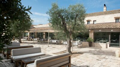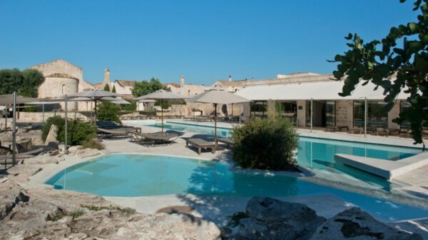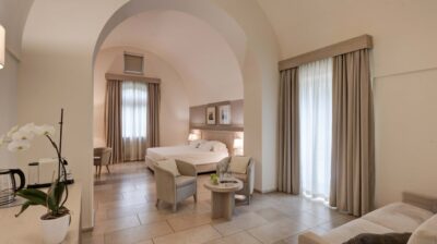 Les espaces communs se déploient dans un rythme apaisé. On y trouve des patios baignés de lumière, des salons voûtés favorables à la lecture ou à une conversation intime, ainsi qu’un spa creusé dans la roche, qui prolonge le caractère intemporel de l’édifice. À l’extérieur, la piscine bordée d’oliviers et les vastes jardins offrent un cadre de détente qui reflète la douceur du sud de l’Italie.