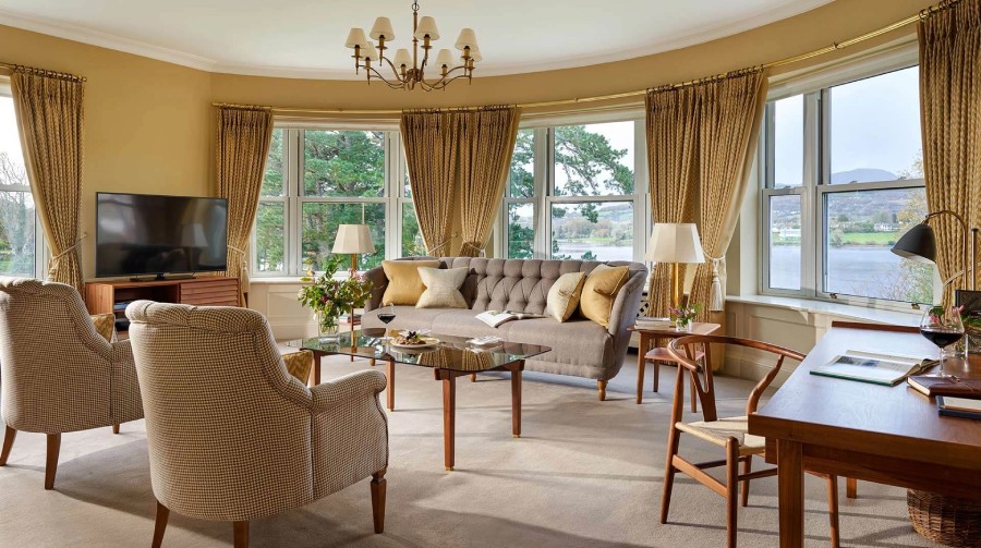 À l’intérieur, les salons se succèdent comme autant de refuges discrets : fauteuils profonds, bibliothèques généreuses, larges baies vitrées ouvertes sur les jardins et la rivière. L’atmosphère est paisible, presque contemplative, portée par une décoration classique rehaussée de touches contemporaines. La gastronomie, quant à elle, rend hommage aux produits du Kerry et aux savoir-faire locaux, dans une cuisine précise, sincère, attentive aux saisons et aux traditions.