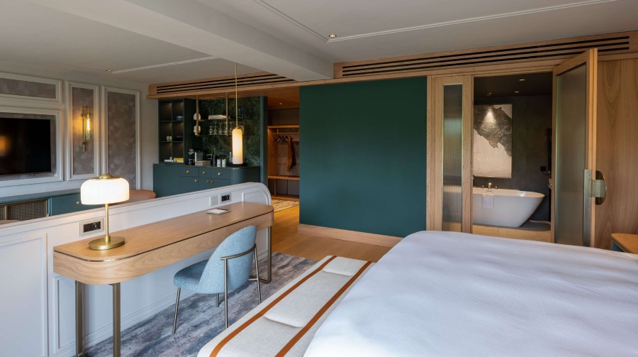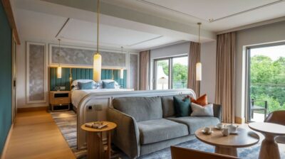 Les chambres et suites, vastes et lumineuses, déclinent une palette de tons sobres ponctués de bois clairs et de textiles élégants. Certaines disposent de terrasses ou de balcons, offrant un dialogue constant avec la nature environnante. Le temps s’y étire naturellement, porté par le silence du lac et la cadence lente des journées irlandaises.