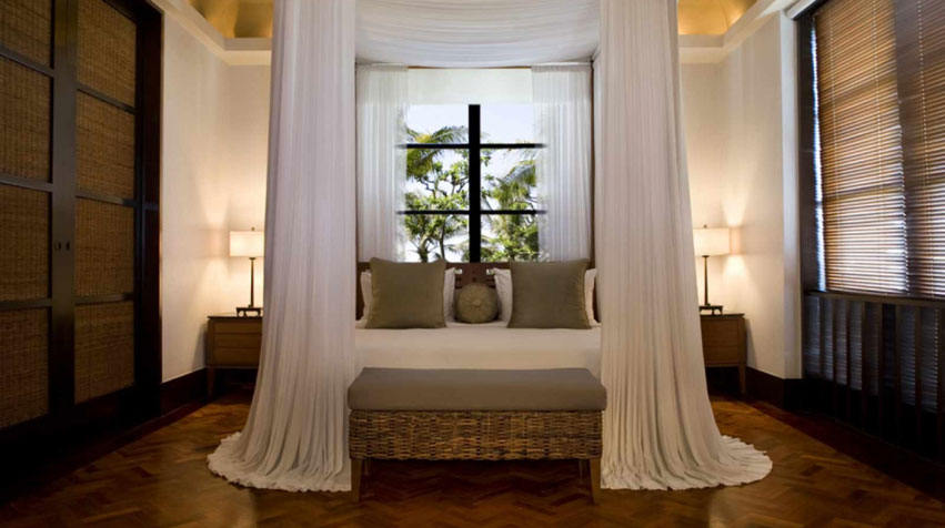 Il offre des suites spacieuses, au sol de parquet marqueté et aux baldaquins de bois exotique qui s'ouvrent sur d'immenses salles de bains où l'ébène le dispute au marbre.