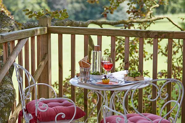 Pourtant, en cheminant le parc boisé de 30 hectares, notre regard s’arrête sur une cabane perchée à sept mètres de hauteur dans les branches épaisses de deux hêtres pourpres séculaires. Autrefois réservée aux enfants, la cabane, aménagée d’une salle de bain et d’une terrasse privées arbore un style contemporain aux lignes sobres et raffinées. Depuis la terrasse de 36 m², nous sommes subjugués par la magnificence des jardins de roses blanches et à la française. Le bleu de la grande piscine extérieure qui contraste avec l’étendue verdoyante du parc attire le regard.